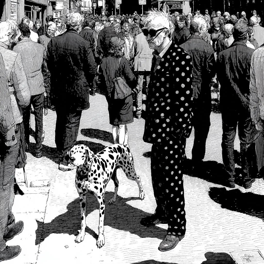 Step into a vibrant scene where the energy of life unfolds in a striking monochrome style reminiscent of David Hockney’s 60s etchings. This captivating illustration features a dapper figure in polka-dot trousers, confidently striding through a bustling crowd, while conversations about last night’s match and current events swirl around. The dynamic interplay of characters and their surroundings creates a lively atmosphere that draws you in.